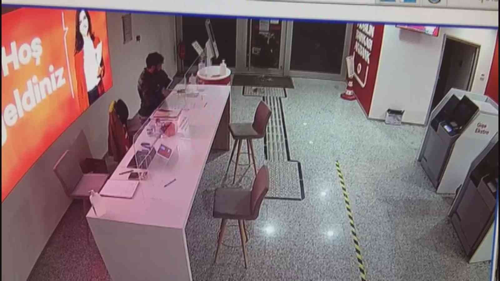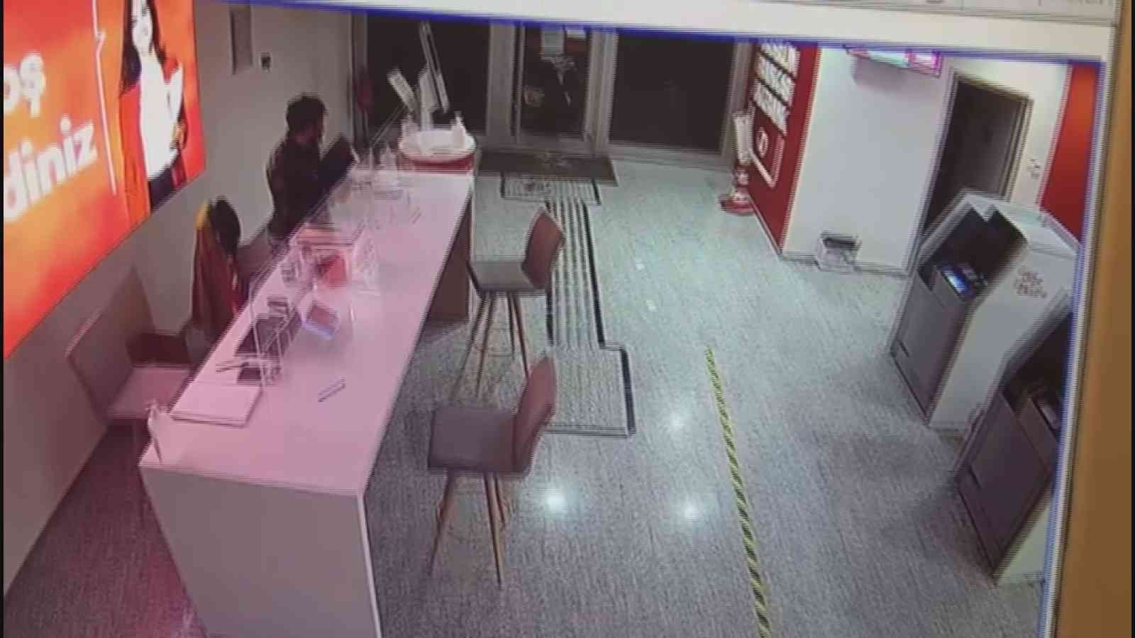 Öte yandan, bankada gerçekleşen hırsızlık anı ise güvenlik kamerasına yansıdı. Görüntülerde elindeki taşı cama atarak kıran ve içeriye giren şüphelinin masanın üzerinde bulunan tabletlerden birisini aldığı görülüyor.