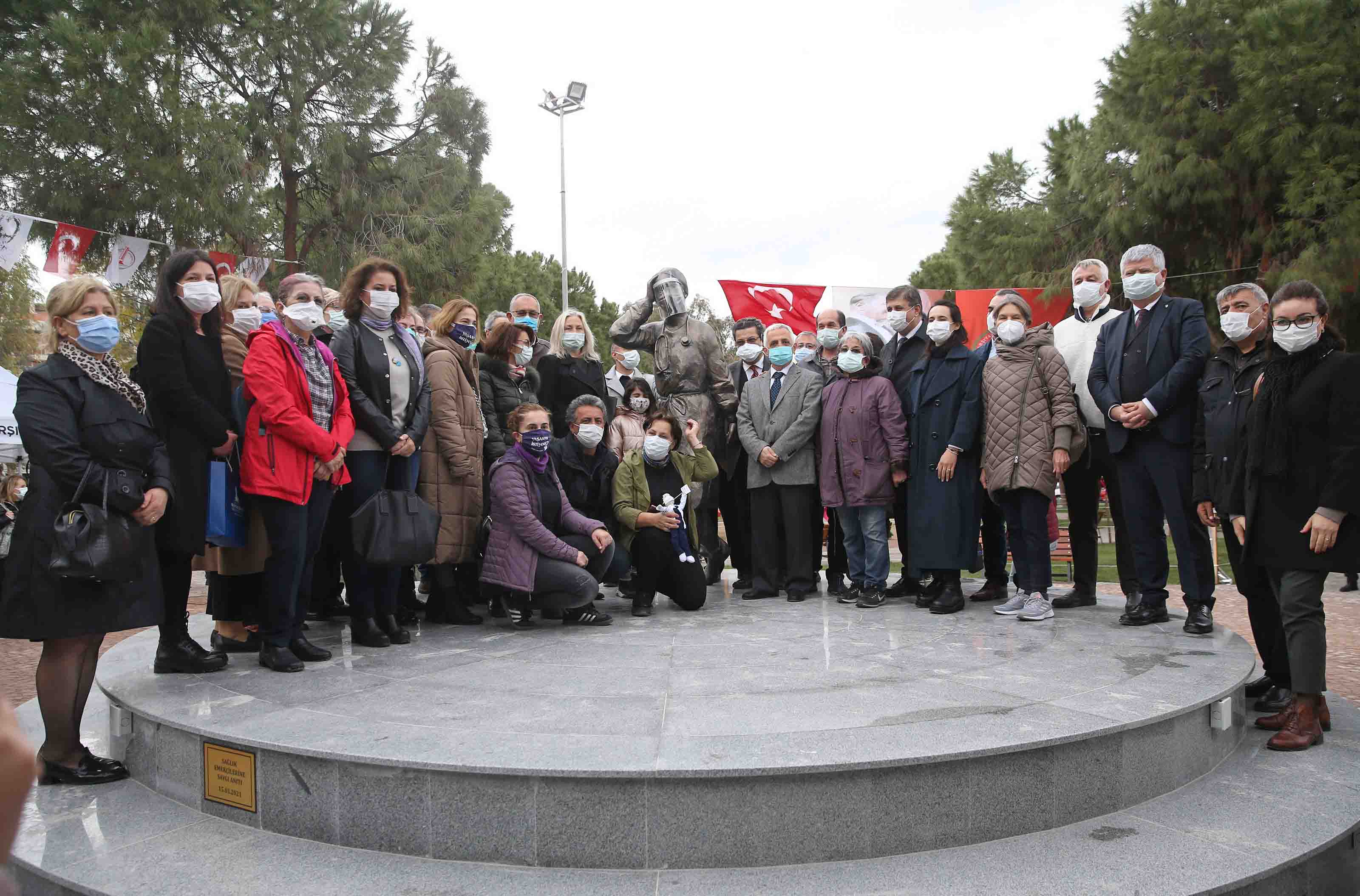 Salgını kontrol altına alabilmek ve toplumun salgını en az etki ve can kaybı ile atlatabilmesi için yaşamları pahasına mücadele eden sağlık emekçilerinin bir kez daha anıldığı törene; İzmir Büyükşehir Belediye Başkan Vekili Mustafa Özuslu, Karşıyaka Belediye Başkanı Dr. Cemil Tugay, İzmir Tabip Odası Başkanı Opr. Dr. Lütfi Çamlı ve yönetim kurulu, Karşıyaka İlçe Sağlık Müdür Cenk Benli; Cumhuriyet Halk Partisi İzmir Milletvekili Atila Sertel, CHP Karşıyaka İlçe Başkanı M. Serdar Koç, İzmir Kent Konseyi Başkanı Nazik Işık, hekimler, Sivil Toplum Kuruluşu ve Meslek Odası temsilcileri katıldı.