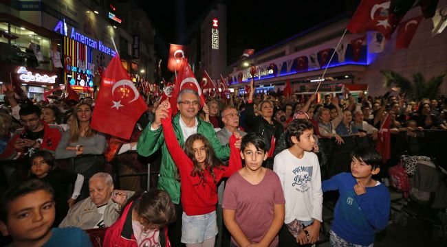 Karşıyaka Belediyesi tarafından organize edilen cumhuriyet Yürüyüşü ve Fener Alayı, akşam saatlerinde belediye binası önünden başladı. Ellerinde Atatürk posterleri ve Türk Bayrakları taşıyan yaklaşık 15 bin kişi, "Mustafa Kemal’in askerleriyiz" ve "Yaşasın Cumhuriyet" sloganları atarak Çarşı boyunca yürüyüş yaptı. Kortejin önünde de dev Atatürk portresi ve Türk Bayrağı taşındı. Coşkulu kalabalığa karşıyaka Belediye Bandosu marşlar çalarak eşlik etti. Çevredeki binalarda bulunanlar da hem alkışlarıyla hem de bayraklarıyla korteje destek oldu. Yürüyüşe Karşıyaka Belediye Başkanı Hüseyin Mutlu Akpınar ve eşi Zehra Akpınar ile birlikte, CHP İlçe Başkanı Uğur Yıldırım ve sivil toplum kuruluşlarının temsilcileri de katıldı.
