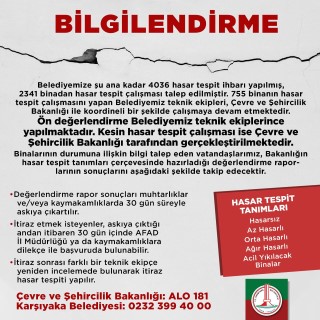 Karşıyaka belediyesi tarafından, hasar tespit başvuruları ve inceleme sayıları ile rapor takip ve itiraz süreçlerine ilişkin, vatandaşları bilgilendirmek amacıyla yapılan açıklama şöyle:
