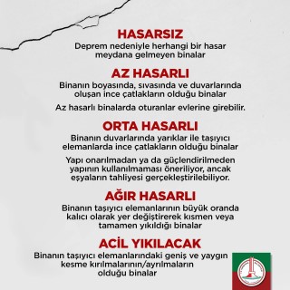 AZ HASARLI: Binanın boyasında, sıvasında ve duvarlarında oluşan ince çatlakların olduğu binalar. Az hasarlı binalarda oturanlar evlerine girebilir.