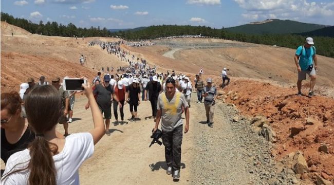 Alanda günlerdir nöbet tutan eylemciler bu sabah büyük buluşma için uyandılar ve saat 12.30’da şantiyeye doğru yürüyüşe geçtiler. Aralarında CHP, HDP ve Emek Partisi milletvekili ve yöneticilerinin de bulunduğu eylemciler jandarmanın engelleme çabalarına rağmen geri adım atmadılar. Saat 13.30’da alana giren protestocular, “Kaz Dağları Andı”nı okudu.