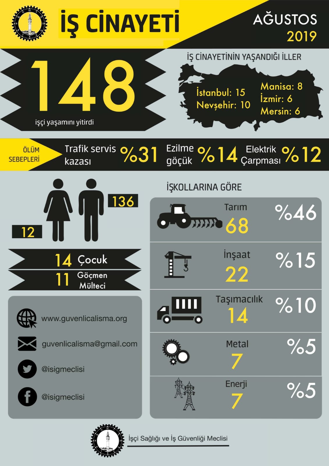 Çocuk işçi çalıştırmanın yasak olmasına rağmen, ucuz iş gücü arayışı nedeniyle tüm sektörlerde illegal olarak çocuk işçi çalıştırılmaya devam ediliyor. Gerekli iş güvenliği ve sağlığı eğitimleri almamış, denetim ve güvenlik konusunda yetersiz çalışma koşullarına küçük yaşlarda maruz kalan çocuklar yine denetimsizliğe bağlı nedenlerden yaşamlarını yitiriyor. Sadece Ağustos ayı rakamlarında 14 çocuğun hayatını kaybetmiş olması bile denetimsizliğin ne boyutlarda olduğunu gözler önüne seriyor.