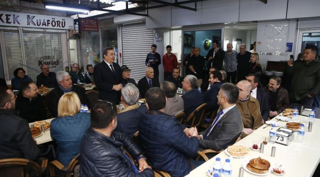 Konak Belediye Başkanı Abdül Batur, Tarihi Kemeraltı Esnaf Derneği Başkanı Semih Girgin, yönetim kurulu üyeleri ve Çarşı esnafı ile Kemeraltı’nın tarihi mekanlarından Küçük Demirhan’da düzenlenen kahvaltıda bir araya geldi. Kemeraltı Çarşısı’nın ihtiyaçları, sorunları ve geleceği üzerine konuşulan buluşmada Başkan Batur, tarihi Çarşı için hep birlikte çalışacaklarını söyledi.