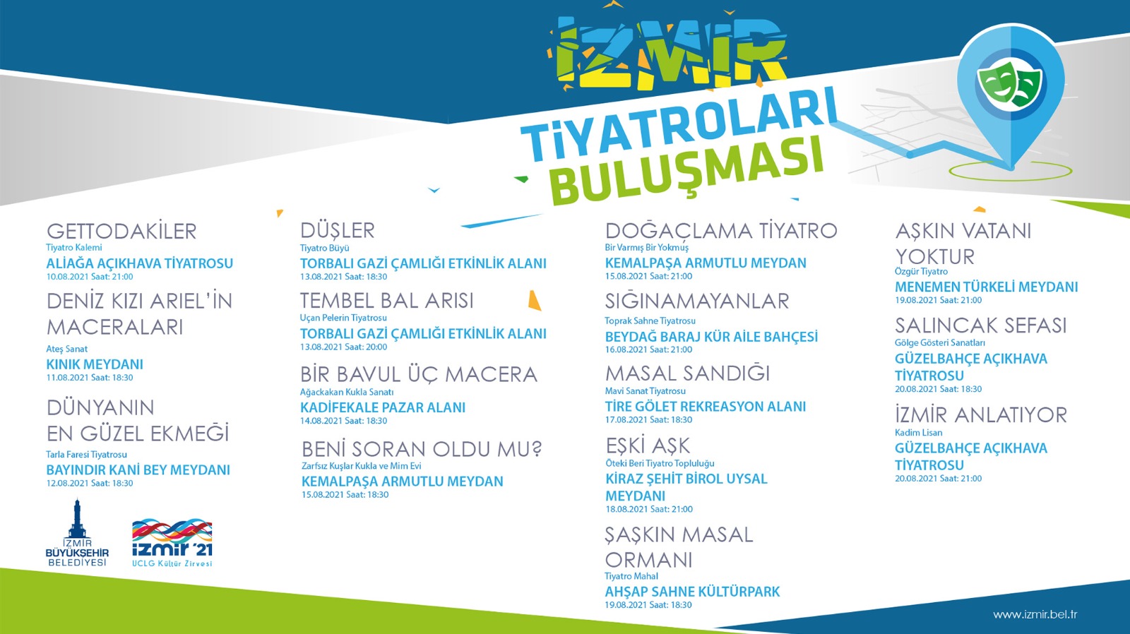 İzmir Büyükşehir Belediyesi 11 ayrı ilçede İzmirli 21 tiyatro ekibini tiyatro severlerle buluşturuyor. İzmir Tiyatroları Buluşması kapsamında 15 oyun 10-20 Ağustos tarihleri arasında sahnelenecek. Aliağa, Kınık, Bayındır, Torbalı, Konak, Kemalpaşa, Beydağ, Tire, Kiraz, Menemen ve Güzelbahçe’de oynanacak oyunların ilk gösterimi “Gettodakiler” saat 21.00’de Aliağa Açıkhava Tiyatrosu’nda sahnelenecek.