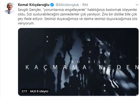 "Sevgili Gençler, “yorumlarınızı engelleyerek” haklılığınızı bastırmak isteyenler oldu. Sizi susturabileceğini zannedenler çok yanılıyor. Zira bir dislike bile çok şey ifade ediyor. Sesinizi duyacağımıza ve daima sesinizi duyuracağımıza söz veriyorum."