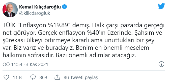 CHP lideri Kılıçdaroğlu, TÜİK'in açıkladığı ekim ayı enflasyon verilerini değerlendirdi.Türkiye İstatistik Kurumu (TÜİK), ekim ayı enflasyon verilerini açıkladı. Buna göre tüketici fiyatları aylık yüzde 2.39 , yıllık yüzde 19.89 arttı ve beklentilerin altında kaldı. Beklenti aylık 2.50, yıllık 20.01 şeklindeydi. Çekirdek enflasyon da yüzde 16.82'de kaldı.Twitter'dan açıklama yapan Kılıçdaroğlu, "TÜİK "Enflasyon yüzde 19.89" demiş. Halk çarşı pazarda gerçeği net görüyor. Gerçek enflasyon %40'ın üzerinde. Şahsım ve şürekası ülkeyi bitirmeye kararlı ama unuttukları bir şey var. Biz varız ve buradayız. Benim en önemli meselem halkımın sofrasıdır. Bazı önemli adımlar atacağız" dedi.