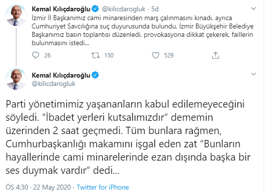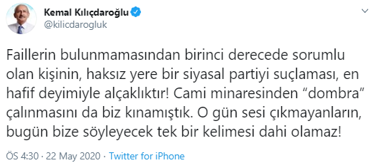 Twitter hesabından paylaşım yapan Kılıçdaroğlu, "Cami minaresinden “dombra” çalınmasını da biz kınamıştık. O gün sesi çıkmayanların, bugün bize söyleyecek tek bir kelimesi dahi olamaz!" ifadelerini kullandı.