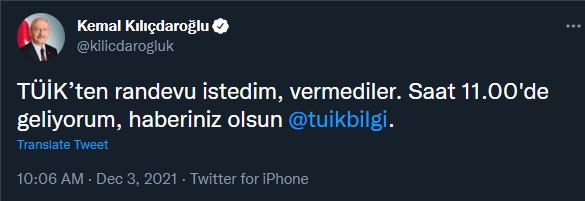 Türkiye İstatistik Kurumu (TÜİK) Cumhuriyet Halk Partisi Genel Başkanı Kemal Kılıçdaroğlu'na randevu vermedi. Kılıçdaroğlu, Twitter'dan bir açıklama yaparak "TÜİK’ten randevu istedim, vermediler. Saat 11.00'de geliyorum, haberiniz olsun" ifadelerini kullandı.