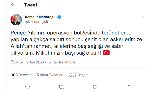 Kemal Kılıçdaroğlu, Pençe-Yıldırım Harekatı bölgesinde şehit olan askerler için sosyal medya hesabından mesaj yayımladı.