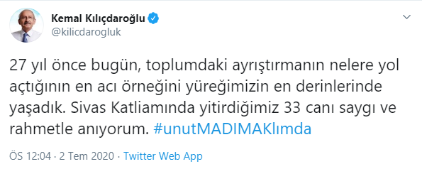 "27 yıl önce bugün, toplumdaki ayrıştırmanın nelere yol açtığının en acı örneğini yüreğimizin en derinlerinde yaşadık. sivas Katliamında yitirdiğimiz 33 canı saygı ve rahmetle anıyorum. #unutMADIMAKlımda"