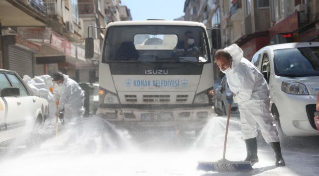 Cadde ve sokakların yıkandığı, konteynerlerin yıkandığı, gerektiğinde yenilendiği temizlik seferberliğinde, dezenfeksiyon ihmal edilmiyor. Virüsle mücadelenin en önemli silahı olan dezenfeksiyon konusunda iki ayrı vardiya olarak çalışan Konak Belediyesi dezenfekesiyon ekipleri, park, oyun alanları başta olmak üzere kamu ve özel sektör işyerleri ile bugüne kadar olduğu tam kapanma sürecinde de adım adım dezenfeksiyon çalışmalarına devam ediyor.