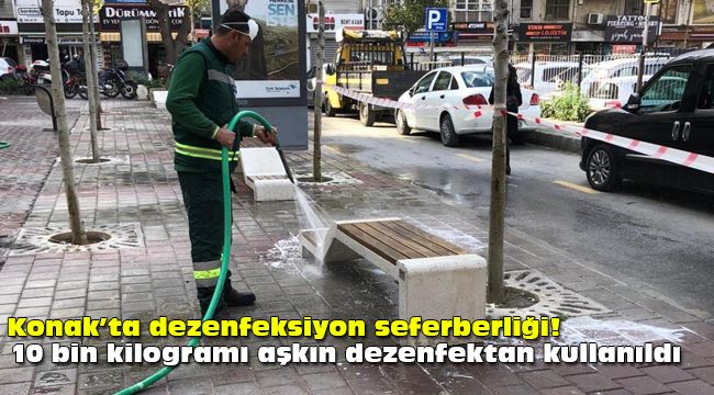 konak belediyesi ekipleri, salgının başladığı ilk günlerde öncelikle halkın toplu olarak bulunduğu pazaryerleri ile nikâh salonlarında başlatılan dezenfeksiyon çalışmalarına, 3 vardiya halinde devam ediyor. Konak’ın en işlek ana caddeleri başta olmak üzere tüm mahallerinde, sokak aralarını da kapsayan dezenfekte çalışmaları yapılıyor. Başta meydanlar, pazaryerleri ve parklar olmak üzere, kamuya açık tüm alanlar düzenli olarak yıkama araçlarıyla dezenfekte ediyor.