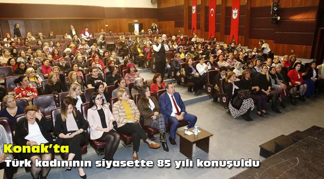 Konak Belediyesi Atatürk Devrimlerinin en önemlilerinden biri olan, Türk kadınına seçme ve seçilme hakkı tanınmasının 85. yıldönümü nedeniyle ‘Siyasette 85 Yıl ve Kadın’ konulu bir panel düzenledi. konak Belediyesi 8 kadın meclis üyesi ile 23 kadın mahalle muhtarının konuşmacı olarak katıldığı panel, Selahattin Akçiçek Kültür Merkezi’nde gerçekleştirildi.