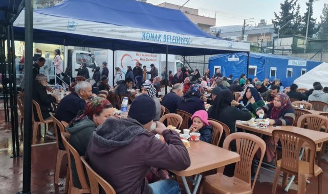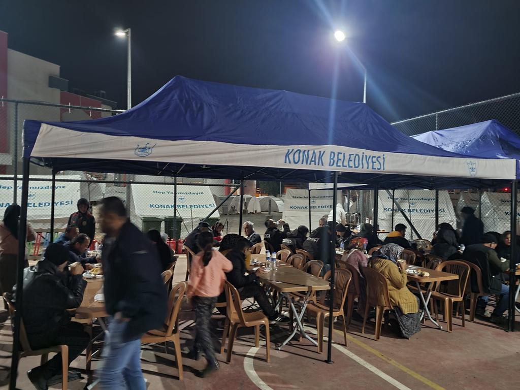 Konak Belediyesi ramazan ayının ilk sahur ve iftar sofrasında, Kahramanmaraş'ın Dulkadiroğlu ilçesinde yaşam alanı haline getirdiği çadır kentte kalan depremzede vatandaşları ağırladı. Çadır kentte kalan yaklaşık 500 depremzede vatandaş, sahurun ardından ramazanın ilk iftar sofrasında orucunu açtı. Konak Belediyesi’nin ramazan ayı boyunca tüm sahur ve iftar sofralarını deprem bölgesinde kuracağını söyleyen Konak Belediye Başkanı Abdül Batur, “6 Şubat’ta ardı ardına meydana gelen depremlerde nice vatandaşımızı kaybettik. Kayıplarımız da acılarımız da çok büyük. O günden beri deprem bölgelerindeki hemşehrilerimiz için elimizden ne geliyorsa yapmaya çalışıyoruz. Ramazan ayı da bize en çok kardeşliği, dayanışmayı, paylaşmayı hatırlatıyor. Bu çok özel günlerde de depremzede vatandaşlarımızın yanında olmak, onlara yalnız olmadıklarını hissettirmek hepimizin öncelikli görevidir diye düşünüyorum. Bu kayıpların, acıların telafisi elbette mümkün olamaz, ama acılarımız da paylaşıldıkça azalsın istiyoruz” diye konuştu.