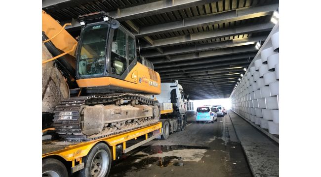 İzmir'in Konak ilçesinde iş makinesi yüklü tır, seyir halindeyken alt geçidin tavanına çarparak sıkıştı. Polis ekiplerinin müdahalesi ile dorsenin lastiklerinin havası indirilerek sıkışan tır kurtarıldı.