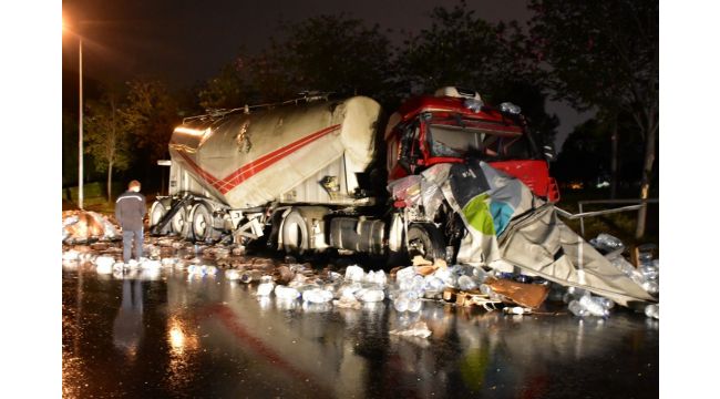 İzmir'de, olumsuz hava şartları nedeniyle kontrolden çıkan bir TIR, park halindeki beton mikserine çarptı. Kazada, TIR sürücüsü yaralanmazken, TIR'daki litrelik su şişeleri yola saçıldı.
