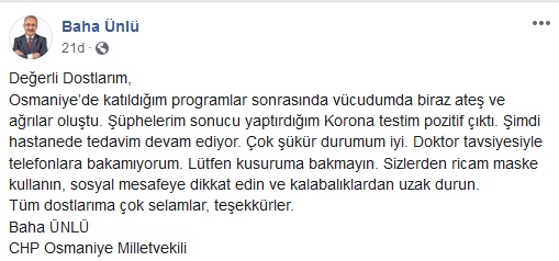 Koronavirüs testi pozitif çıkan chp Osmaniye Milletvekili Baha Ünlü, sosyal paylaşım sitesi Facebook'taki hesabından açıklama yaptı.
