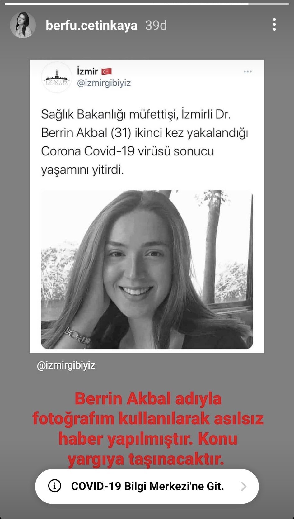 Berfu Çetinkaya da kişisel Instagram hesabından yaptığı paylaşımda "Berrin Akbal adıyla fotoğrafım kullanılarak asılsız haber yapılmıştır. Konu yargıya taşınacaktır" dedi.