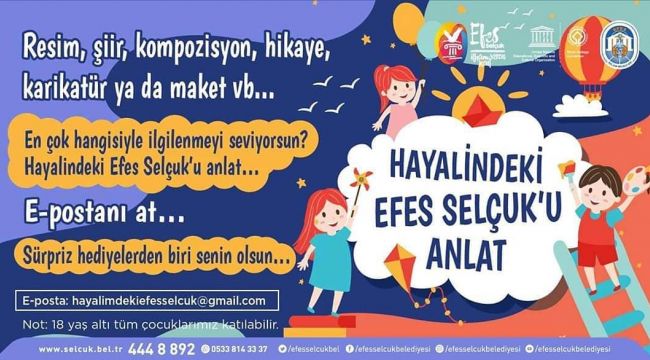 efes selçuk belediyesi kentin çocuklarını hayallerindeki Efes Selçuk’u anlatmaya davet ediyor. “Hayalindeki Efes Selçuk’u Anlat” sloganıyla yapılan çağrıda Efes Selçuk’ta yaşayan 18 yaş altı tüm çocuklar resim, şiir, kompozisyon, hikaye, karikatür ya da maketle hayallerindeki Efes Selçuk’u anlatacak. Çalışmalarını tüm Efes Selçuk ile paylaşma şansına sahip olan çocuklar, sürpriz hediyeler de kazanacak.