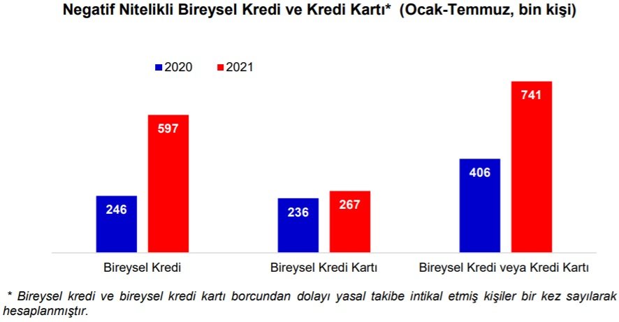 Türkiye bankalar birliği (TBB) Risk Merkezi, negatif nitelikli bireysel kredi ve kredi kartı verilerini açıkladı.Sözcü'den Emre Deveci'nin haberine göre; Kredilerin yasal takibe düşme sürelerinin uzatılmasına ve pandemi döneminde getirilen yapılandırma imkanlarına rağmen, borcunu ödeyemediği için takibe düşen kişi sayısındaki artış dikkat çekti.YEDİ AYDA 741 BİN KİŞİ TAKİBE DÜŞTÜBuna göre, bireysel kredi veya bireysel kredi kartı borcundan dolayı yasal takibe intikal etmiş kişi sayısı 2021 yılının Ocak-Temmuz döneminde, önceki yılın aynı dönemine göre yüzde 82 artarak 741 bin kişiye yükseldi.Bireysel kredi kartı borcundan dolayı yasal takibe intikal etmiş kişi sayısı 2021 yılı Ocak-Temmuz döneminde bir önceki yılın aynı dönemine göre yüzde 13 oranında artarak 267 bin kişi oldu.Bireysel kredi borcundan dolayı yasal takibe intikal etmiş kişi sayısı ise aynı dönemde yüzde 143 artışla 597 bin kişiye yükseldi.