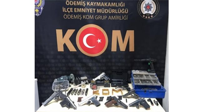 Ödemiş İlçe Emniyet Müdürlüğü Kaçakçılık ve Organize Suçlarla Mücadele (KOM) Grup Amirliği ekipleri, ilçede bulunan bir adreste kuru sıkı tabancaların namlularının açılarak, kuru sıkıdan bozma tabanca yapıldığına dair aldığı bilgi üzerine çalışma başlattı. Harekete geçen ekiplerin adrese yaptığı operasyonda, 8 adet ruhsatsız tabanca, 1 adet tüfek, 13 adet şarjör, 10 adet şarjör yayı, 7 adet sürgü, 46 adet namlu aparatı, 40 adet parçalı namlu aparatı, 74 adet fişek ve namlu açmaya yarayan çeşitli aletler ele geçirildi.