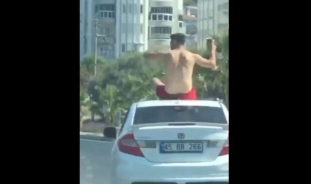 Aydın'ın kuşadası ilçesinde, otomobilin tavanında oturarak seyahat eden kişi hem kendisinin hem de trafikteki diğer sürücülerin güvenliğini hiçe saydı. Polisin kısa sürede tespit ettiği S.K. ve otomobilin sürücüsü A.G.'ye toplam 392 TL ceza kesildi.Manisa´dan Kuşadası´na tatile gelen arkadaşlar S.K. ile A.G.'nin tehlikeli yolculuğu hem kendilerinin hem de trafikteki diğer sürücülerin güvenliğini tehlikeye attı. Kuşadası Candan Tarhan Bulvarı üzerinde seyir halindeki 45 BB 266 plakalı otomobilin tavanına oturan, bir elinde bira şişesi ve sigarası olan yarı çıplak kişiyi görenler o anları önce kayda aldı, ardından polise bildirdi. Daha sonra ise kaydettikleri görüntüleri sosyal medyada paylaştı.KISA SÜREDE TESPİT EDİLDİKent Güvenlik Yönetim Sistemi (KGYS) ile otomobilin yerini tespit eden Kuşadası polisi, kısa sürede 2 kişiye ulaştı. Otomobilin sürücüsü A.G. ile aracın tavanında oturan S.K. hakkında trafik güvenliğini tehlikeye sokmak suçunu işledikleri için hem adli işlem başlatıldı hem de 392 TL idari para cezası yazıldı.HABERTÜRK