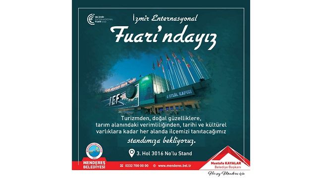 Herkesi İzmir Enternasyonal Fuarı’na ve Menderes Belediyesi standına davet eden Menderes Belediye Başkanı Mustafa Kayalar, “İzmir’in geçmişten bu yana dünyaya tanıtımında en büyük etkenlerden olan İzmir Enternasyonal Fuarı’nda Menderes Belediyesi olarak biz de yer alacağız. Güzel ilçemizi tüm yanlarıyla fuarda tanıtacağız. Turizmden, doğal güzelliklere, tarım alanındaki verimliliğinden, tarihi ve kültürel varlıklara kadar her alanda tanıtımımızı gerçekleştireceğiz. Menderes standımıza gelen vatandaşlarımız Menderes’e dair her şeye ulaşabilecek” diye konuştu.