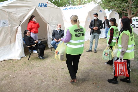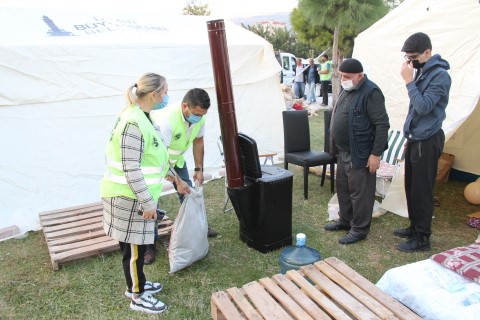 Bayraklı’da oluşturulan çadır alanında depremzedelerle bir araya gelen menderes Belediye Başkanı mustafa Kayalar, “ Kurduğumuz gönül köprüsü ile Bayraklı’da ki depremzedeler için topladığımız yardımları bölgeye ulaştırdık.