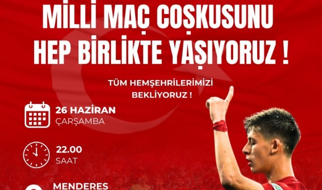 Menderes Belediyesi tarafından gerçekleştirilecek etkinlikle Avrupa Şampiyonası'nda bu akşam grubunda Çekya Milli Takımı ile son maçına çıkacak olan A Milli Futbol Takımı'nın mücadelesi dev ekranda izlenecek.