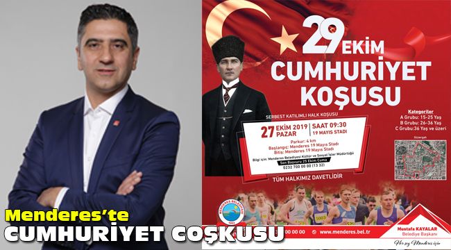 Etkinlikler kapsamında Cumhuriyet Koşusu ise 27 Ekim Cumartesi günü gerçekleşecek. Başlangıç ve bitiş noktasının Menderes 19 Mayıs Stadı’nın olduğu Cumhuriyet Koşusu 4 kilometrelik parkurda, 15-25 yaş, 26-36 yaş, 36 yaş ve üzeri olmak üzere 3 kategoride düzenlenecek.