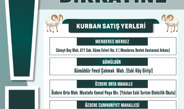 Menderes’te Kurban Bayramı öncesi kurbanlık satışı ve kesim yerleri belli oldu.Menderes Belediyesi yaklaşan Kurban Bayramı öncesi hazırlıklarını sürdürürken kurbanlık satış yeri ve kurban kesim noktaları da belli oldu. Kesim yeri olarak tek nokta belirlenirken, 4 farklı noktada ise kurban satış yerleri hazırlandı.Bayram sonuna kadar açık kalacakMerkez pazaryeri kurban kesim yeri olarak belirlenirken, ilçe genelinde vatandaşların rahat şekilde kurban alışverişlerini gerçekleştirilmesi için Menderes merkezde Menderes Devlet Hastanesi arkası, Gümüldür’de eski köy girişi, Özdere Orta Mahalle’de yıkılan eski turizm otelcilik okulu ve Özdere Cumhuriyet Mahallesi’nde de köy girişinde satış alanı kuruldu.Kurban mesaisiKurban bayramı için tüm hazırlıkların sürdüğünü belirten Menderes Belediye Başkan V. Erkan Özkan, ‘’ Mübarek Kurban Bayramı öncesinde ilçe genelimizde ki hazırlıklarımız sürüyor. Kurban satış ve kesim yerlerimiz belirlendi. Bayrama kadar gerekli olan tüm çalışmaları ve kontrolleri gerçekleştireceğiz. Bayram süresi boyunca da ekiplerimiz vatandaşlarımızın hizmetinde olacak’ dedi.