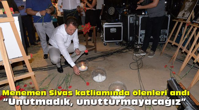 Koronavirüs salgını önlemleri kapsamında gerçekleştirilen tören, saygı duruşu ve İstiklal Marşı’yla başladı. Daha sonra konuşan Menemen Belediye Başkanı Serdar Aksoy yaptığı konuşmada 2 Temmuz 1993 tarihinde yaşananların ülke tarihinde kara bir leke olarak yer aldığını belirtti. Başkan Aksoy, “Tam 27 yıl geçmiş ama acısı dinmedi. Unutmadık, unutturmayacağız. Unutulmaması için de mücadele edeceğiz. Çorum’da yaşanan katliam, Maraş’ta, Sivas’ta yaşanan katliam. Bunlar bizim tarihimizde maalesef var. Buralarda katledilen insanlarımızı hiçbir şekilde unutmamamız gerekiyor. sivas Katliamı yaşanırken olanlar hepimizin gözü önünde cereyan etti. Saatlerce o otelin içinde hapsolan insanlar, dünyanın gözü önünde cayır cayır yakıldılar. Daha sonraki dava süreçlerine bakıldığı zaman orada da bir garabet vardı. Katliamı gerçekleştirenlerin pek çoğu yakalanamadı, yakalananlar da bir sür sonra serbest bırakıldı. Ama biz o canlarımızı asla unutmadık” dedi. Sivas Katliamı’nın çocuklara, gençlere anlatılması gerektiğine değinen Aksoy, “Bir daha bu katliamların yaşanmaması için, bir daha aydın insanların, gençlerin, çocukların yakılmaması için evlatlarımıza bunu anlatmak zorundayız. Bu duygularla Madımak’ta yitirdiğimiz 2’si otel görevlisi 33’ü sanatçı olmak üzere 35 insanımızı saygıyla anıyorum” dedi.