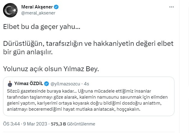 İYİ Parti Genel Başkanı Meral Akşener, Yılmaz Özdil'in Sözcü gazetesi ile yollarının ayrılmasıyla ilgili sosyal medya hesabından bir paylaşım yaptı.Geçtiğimiz gün Sözcü TV’den ayrıldığını açıklayan Yılmaz Özdil, sosyal medya hesabından yaptığı açıklamada, gazeteden de ayrıldığını duyurdu. Özdil, "Sözcü gazetesinde buraya kadar" sözleri ile yaptığı açıklamada, doğru bildiğini anlatmaya çalıştığını ancak anlatmayı beceremediğini ifade etti.Akşener, Özdil'in duyurusuyla ilgili Twiter hesabından paylaşım yaparak "Yolunuz açık olsun" dedi.Akşener, paylaşımında şunları kaydetti:"Elbet bu da geçer yahu... Dürüstlüğün, tarafsızlığın ve hakkaniyetin değeri elbet bir gün anlaşılır. Yolunuz açık olsun Yılmaz Bey."
