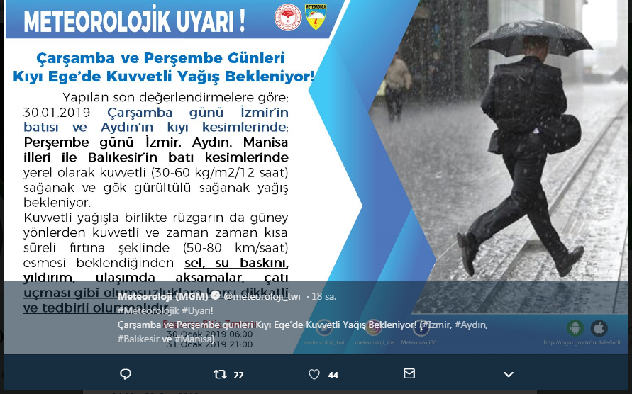 Meteorolojiden, İzmir, Aydın, Manisa, Muğla, Antalya ve Balıkesir kuvvetli yağış uyarı yapıldı. Son hava durumu değerlendirmelerine göre, İzmir'in batısı ve Aydın'ın kıyı kesimlerinde, perşembe günü İzmir, Aydın, Manisa ile Balıkesir'in batı kesimlerinde yerel olarak kuvvetli sağanak ve gök gürültülü sağanak bekleniyor.
