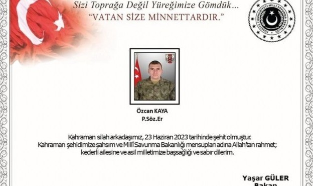 Pençe harekat bölgesinde 15 Haziran teröristlerin açtığı ateş sonucu yaralanan Piyade Sözleşmeli Er Özcan Kaya, tedavi gördüğü hastanede şehit oldu.Milli Savunma Bakanlığı'ndan yapılan açıklamada, "Pençe operasyonu bölgesinde, 15 Haziran 2023 tarihinde, teröristlerce yapılan taciz atışı sonucunda yaralanarak hastaneye sevk edilen kahraman silah arkadaşımız Piyade Sözleşmeli Er Özcan Kaya, tedavi gördüğü hastanede yapılan tüm müdahalelere rağmen kurtarılamayarak 23 Haziran 2023 tarihinde şehit olmuştur" denildi.