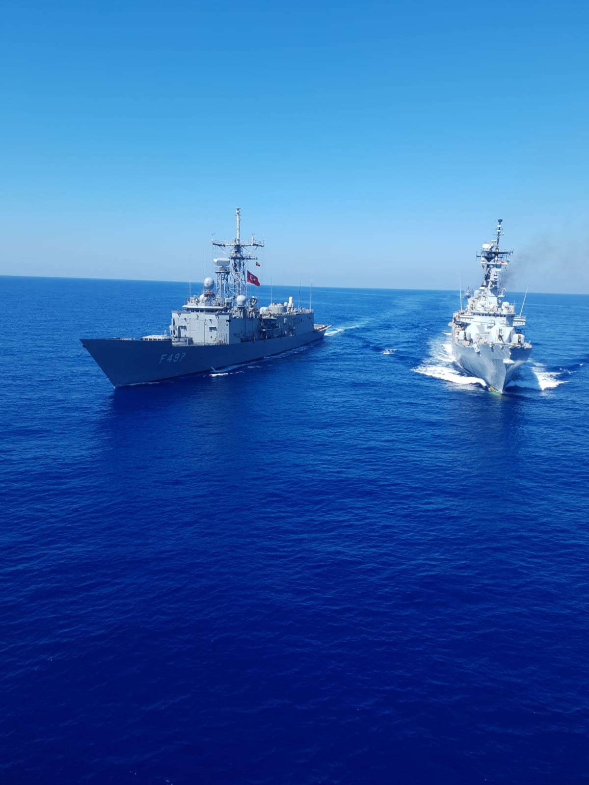 MSB: "TCG GÖKSU ve TCG FATİH fırkateynleri ile İtalyan muhribi ITS DURAND DE LA PENNE tarafından 25 Ağustos 2020 günü, Doğu Akdeniz’de birlikte çalışabilirlik ve koordinasyonun geliştirilmesi maksadıyla geçiş eğitimleri icra edilmiştir."
