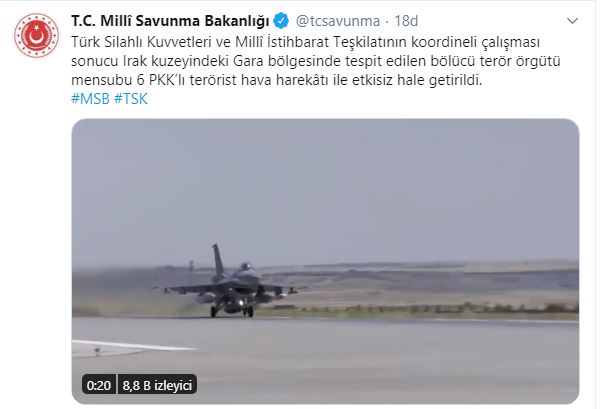 Milli Savunma Bakanlığı(MSB), ''Türk Silahlı Kuvvetleri ve Millî İstihbarat Teşkilatının koordineli çalışması sonucu Irak kuzeyindeki Gara bölgesinde tespit edilen bölücü terör örgütü mensubu 6 PKK’lı terörist hava harekâtı ile etkisiz hale getirildi.'' açıklamasında bulundu.
