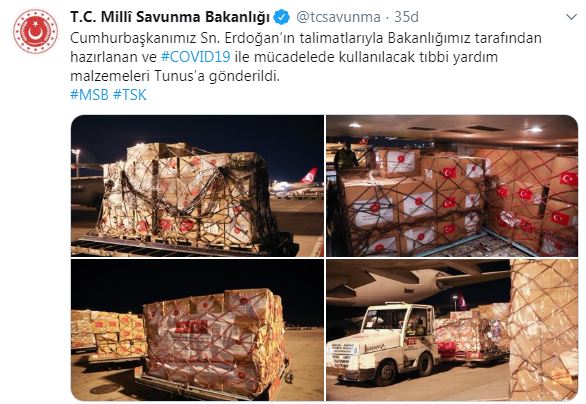 Milli Savunma Bakanlığı, Cumhurbaşkanı ve AKP Genel Başkanı Recep Tayyip Erdoğan'ın talimatıyla, Tunus’a tıbbi yardım malzemeleri gönderildiğini duyurdu.