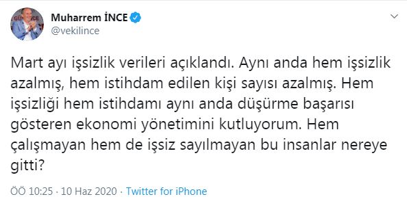 “Aynı anda hem işsizlik azalmış, hem istihdam edilen kişi sayısı azalmış” diyen Muharrem İnce, “Hem işsizliği hem istihdamı aynı anda düşürme başarısı gösteren ekonomi yönetimini kutluyorum. Hem çalışmayan hem de işsiz sayılmayan bu insanlar nereye gitti?” ifadelerini kullandı.
