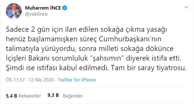 * Sadece 2 gün için ilan edilen sokağa çıkma yasağı henüz başlamamışken süreç Cumhurbaşkanı'nın talimatıyla yürüyordu, sonra milleti sokağa dökünce İçişleri Bakanı sorumluluk “şahsımın” diyerek istifa etti. Şimdi ise istifası kabul edilmedi. Tam bir saray tiyatrosu.