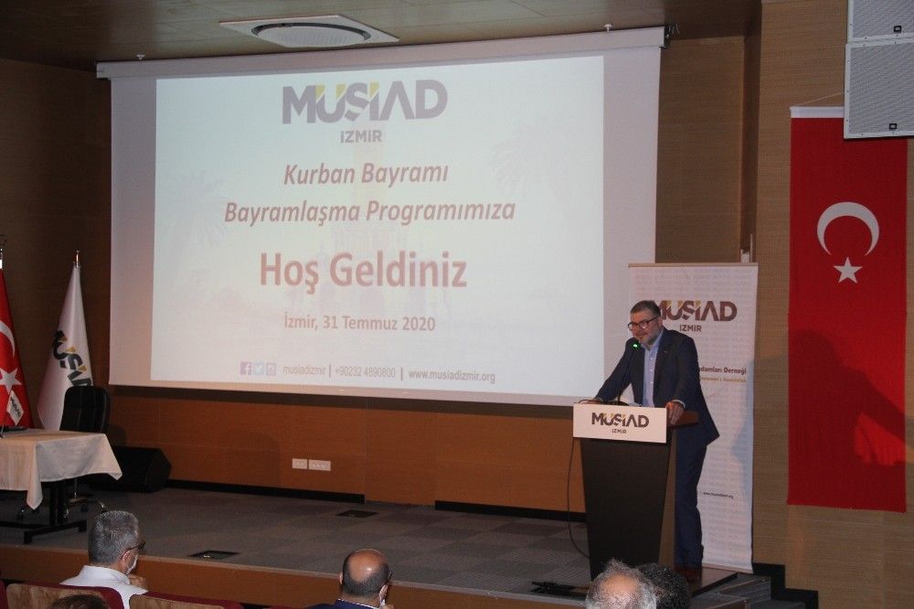 Bayramlaşma merasiminde konuşma yapan MÜSİAD İzmir Şubesi Başkanı Bilal Saygılı, tüm islam aleminin bayramını tebrik ederek sözlerine başladı. Saygılı, MÜSİAD'ın yüksek ahlak ve yüksek teknoloji mottosunu hatırlatarak, "Ümmet-i Muhammed'in en çok önemsediği ve ihtiyaç duyduğu konu: adalet ve merhamet. Dünya'nın birçok yerindeki müslümanlar zulüm altında doğup sıkıntı içerisinde imtihanlarını çok çetin bir şekilde veriyorlar. Bizler de bu konforlu ortamlarda başımızdaki bir mücahit olan ve bizimde davamızın başı olan cumhurbaşkanımız Recep Tayyip Erdoğan beyefendinin önderliğinde güzellikle yaşıyoruz. Fakat unutmayalım ki kestiğimiz kurbanlar öbür tarafta bizim kurtarıcımız olmayacak. Cumhurbaşkanımızıni İslam Ülkeleri Konferansı'nda söylemiş olduğu 'Biz yaptıklarımızdan sorumlu olacağız ama yapabilecek haldeyken yapmadıklarımızdan da sorumlu olacağız' lafını hiç unutmuyorum. Osmanlı ruhumuzun canlanması adına hepimize ayrı ayrı görev düşüyor" ifadelerini kullandı.