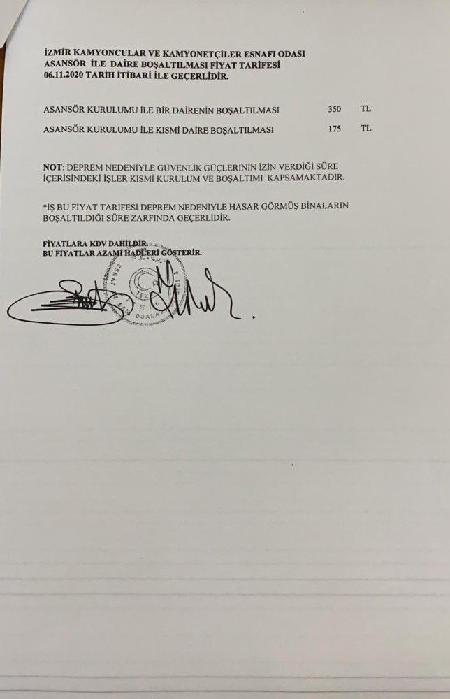 İzmir Valisi Yavuz Selim Köşger Twitter hesabından yaptığı açıklamada "Depremzede vatandaşlarımızın taşınmalarında kullanacakları asansör rayici belirlenmiş olup bunun dışında talepte bulunanların Valiliğimize bildirilmesi durumunda cezai işlem uygulanacaktır" dedi.