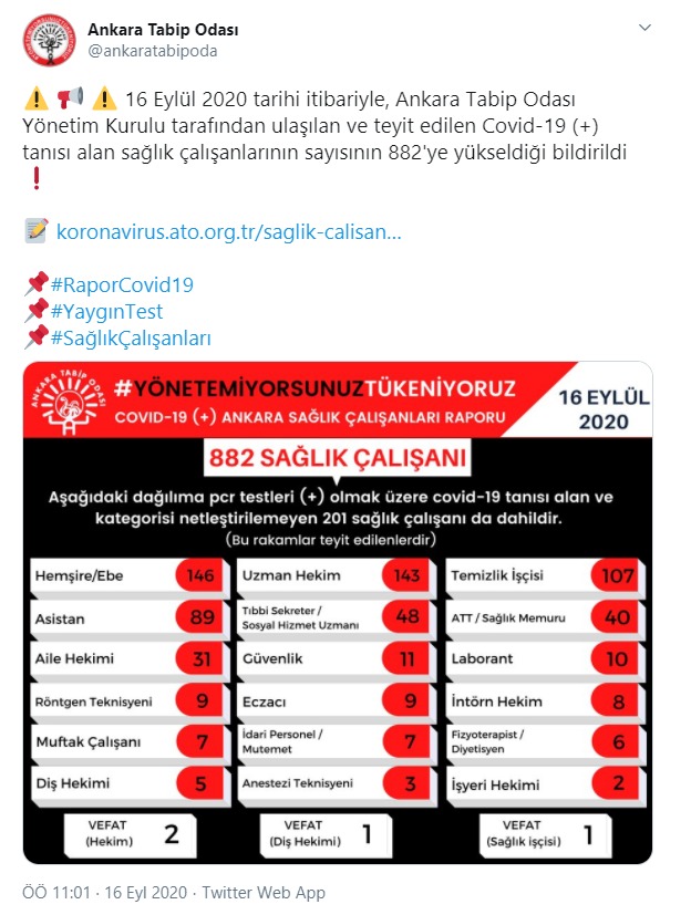 Oda yönetim kurulu tarafından, "16 Eylül 2020 tarihi itibariyle, Ankara Tabip Odası Yönetim Kurulu tarafından ulaşılan ve teyit edilen Covid-19 (+) tanısı alan sağlık çalışanlarının sayısının 882'e yükseldiği bildirildi" ifadeleri kullanıldı.