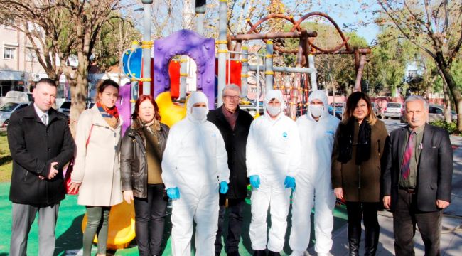 Ödemiş Belediyesi, parklardaki çocuk oyun gruplarını özel ürünlerle dezenfekte etmek için çalışma başlattı. Çalışma ilçedeki parklarda periyodik olarak sürdürülecek.