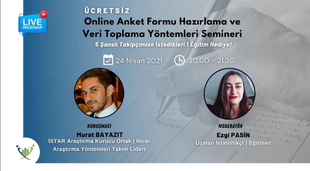 Türkiye'nin en aktif online istatistik eğitimi veren kurumu olan İSTAR Araştırma & Eğitim Danışmanlık, Uzman İstatistikçi ve Eğitmen Ezgi Pasin’in moderatörlüğünde ÜCRETSİZ “Online Anket Formu Hazırlama ve Veri Toplama Yöntemleri” semineri düzenliyor.