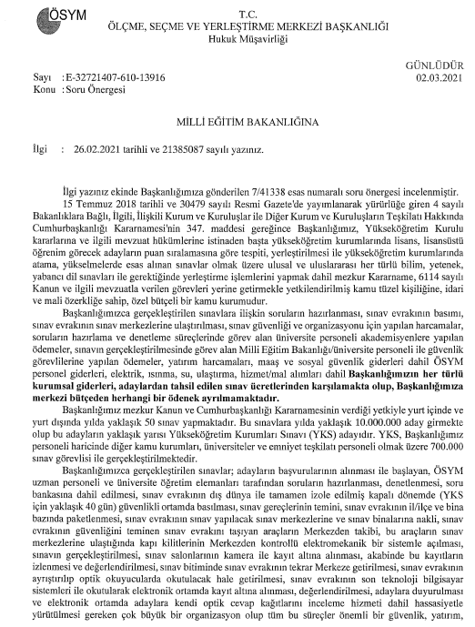 CHP Karaman Milletvekili İsmail Atakan Ünver, Ölçme Seçme ve Yerleştirme Merkezi (ÖSYM)tarafından hazırlanan YKS başvuru ücretlerine yapılan zammı Meclis gündemine taşıdı. Enflasyon rakamının da üzerinde bir oranla yüzde 29 zamlanan sınav başvuru ücretleri, her bir sınav başına 70 TL iken 90 TL olarak belirlenmişti.Ankara Büyükşehir Belediyesi'nin ihtiyaç sahibi ailelerin çocuklarının üniversite sınav ücretlerini karşılayacağını hatırlatan CHP'li Ünver, başvuru ücretlerindeki artışın sebebini sordu. Ayrıca Ünver, ÖSYM tarafından gerçekleştirilen sınavlarda öğrencilerden alınan sınav başvuru ücretlerinin ve sınavlara harcanan toplam kaynak miktarının ne kadar olduğunu sordu."ÖDENEK ALMIYORUZ" DİYE YANITIÖSYM Başkanlığı'ndan gelen yanıt ise dikkat çekti. ÖSYM, "ÖSYM personel giderleri, elektrik, ısınma, su, ulaştırma, hizmet/mal alımları dahil Başkanlığımızın her türlü kurumsal giderleri, adaylardan tahsil edilen sınav ücretlerinden karşılamakta olup, Başkanlığımıza merkezi bütçeden herhangi bir ödenek ayrılmamaktadır" diye yanıt verdi.İşte o yanıt: