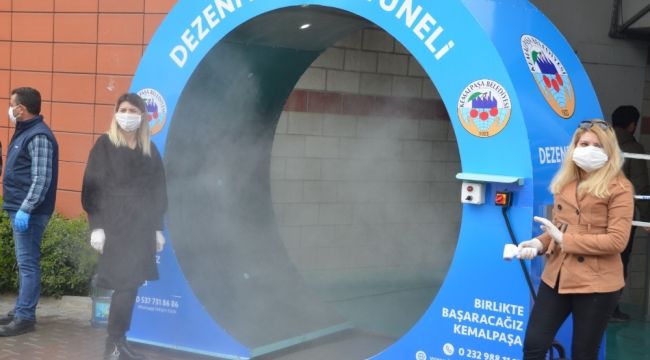 İzmir Kemalpaşa'da pazaryeri girişinde dezenfekte tüneli oluşturuldu. Sensörlü olarak çalışan dezenfekte tünelinin içindeki dezenfektenin insan sağlığına zararlı olmadığını belirten Kemalpaşa Belediye Belediye Başkanı Rıdvan Karakayalı, "Kemalpaşa'da çok yoğun bir şekilde kullanılan pazarımızda önlemlerimizi en üst seviyeye çıkardık. Denetim için giriş ve çıkışları kontrol altına aldık. Bizim için hemşehrilerimizin sağlığı çok önemli. Bu konuda elimizden geleni yapıyoruz. Hemşehrilerimden de kendi sağlıkları için tüm bu önlemlere uymalarını rica ediyorum. Lütfen evlerinizde kalın ve aldığımız tedbirlere uyun ve uygulayın. Bu hepimizin mücadelesi. Bu felaketi her birlikte aşabiliriz" diye konuştu. Pazaryerine giren her vatandaş ise tüneli kullanarak içeri girerken, yapılan çalışmadan mutlu olduklarını dile getirdi. Dezenfekte tüneli, pazaryerinin kapalı olduğu günlerde ise ilçe merkezinde vatandaşların yoğun kullandığı alanlarda kurulacak.