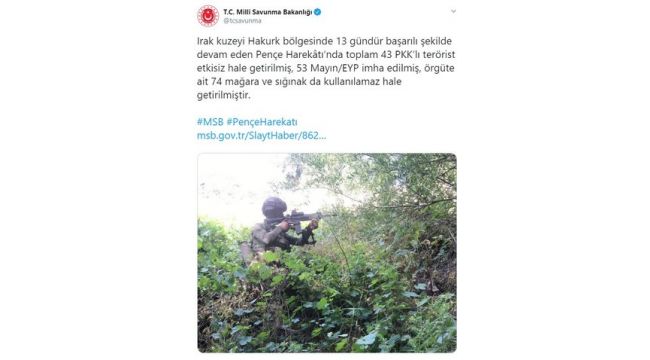 Milli Savunma Bakanlığı'ndan yapılan açıklamada, "Irak kuzeyi Hakurk bölgesinde 27 Mayıs 2019 tarihinde başlayan ve planlandığı şekilde başarıyla devam eden Pençe Harekâtı'nda; harekâtın başlangıcından bu güne kadar toplam 43 PKK'lı terörist etkisiz hale getirilmiştir. Harekât kapsamında örgüt tarafından tuzaklanan 53 adet Mayın/EYP tespit edilerek imha edilmiş; bölücü teröristlere ait 74 mağara ve sığınak da kullanılamaz hale getirilmiştir" denildi.