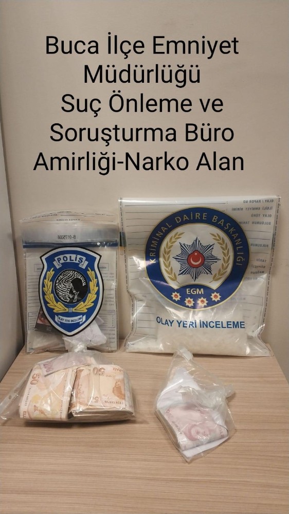 Buca İlçe Emniyet Müdürlüğü ekipleri, şüphe üzerine seyir halindeki bir otomobili durdurdu. Ekipler daha sonra araçta aramalar yaptı. Otomobilde yapılan aramada; 400 gram metamfetamin, bir miktar bonzai maddesi ve uyuşturucu madde içiminde kullanılan materyaller ele geçirildi. Polis ekipleri, uyuşturucu maddelerin bulunması üzerine otomobildeki 5 kişiyi gözaltına aldı.